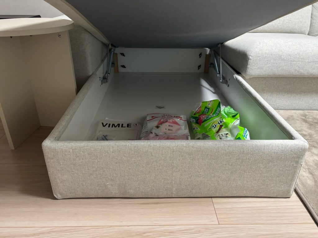 こちらのお宅では、【収納付きソファ】を活用して猫用品をまとめて収納。