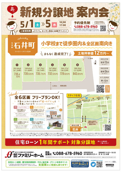 徳島営業所では、4/29(祝)・5/1(土)~5(水)に新規分譲地の案内会を開催予定です!