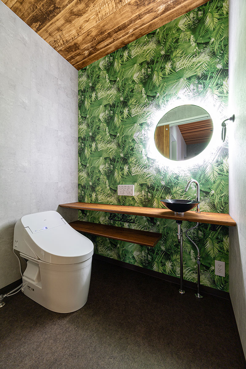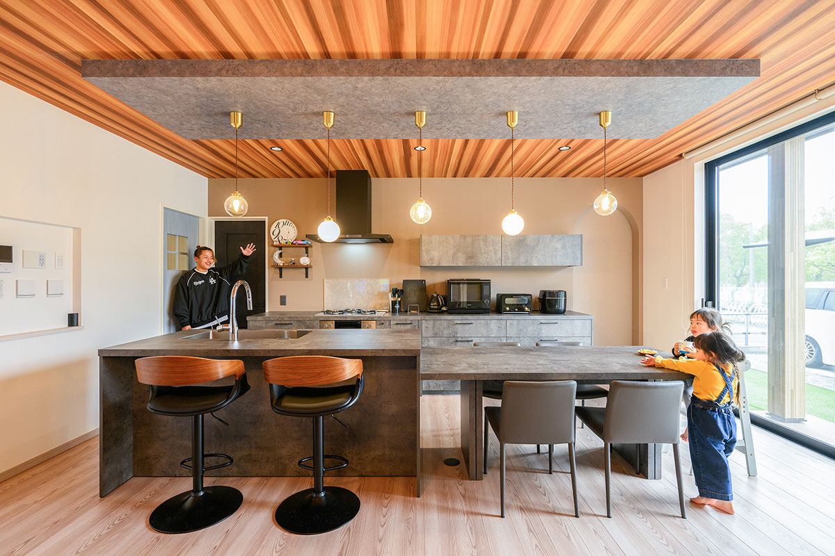 丸窓がアクセントの和モダンな外観。 LDKは、シックな印象のキッチンと温かみのある畳スペースが心地よい調和を生み出す、家族団らんの空間に仕上がりました。 こだわりの離れでは、趣味を存分に楽しむことができます。